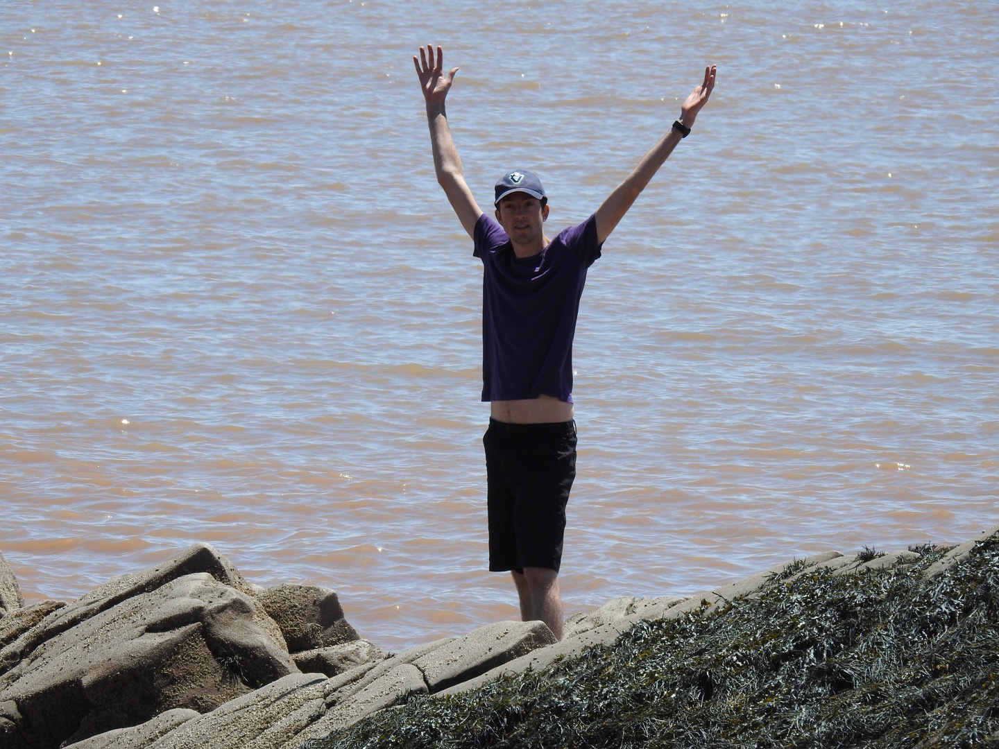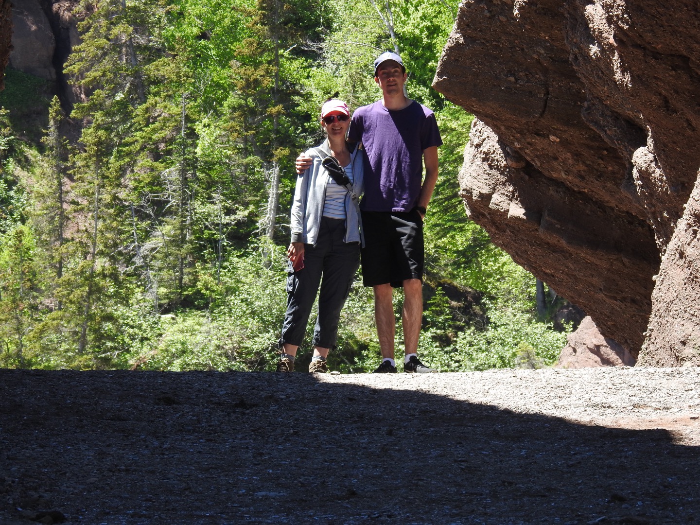The tide would be out until about 745pm, so we had lots of time. Zach was kind enough to drive, so I got to be a passenger in the back seat and check out the scenery. As we made our way to Fundy Park, we drove over the Chocolate (Petitcodiac) River – it does look a lot like milk chocolate. After a 35 minute drive, we arrived at Hopewell Rocks and sat down by the truck to have a bite of lunch. Admission to the park was $10 for each of us. Zach was not impressed. He said, ‘Provincial Parks should be free to visit but since we paid, we are going to see every bit of this park’.