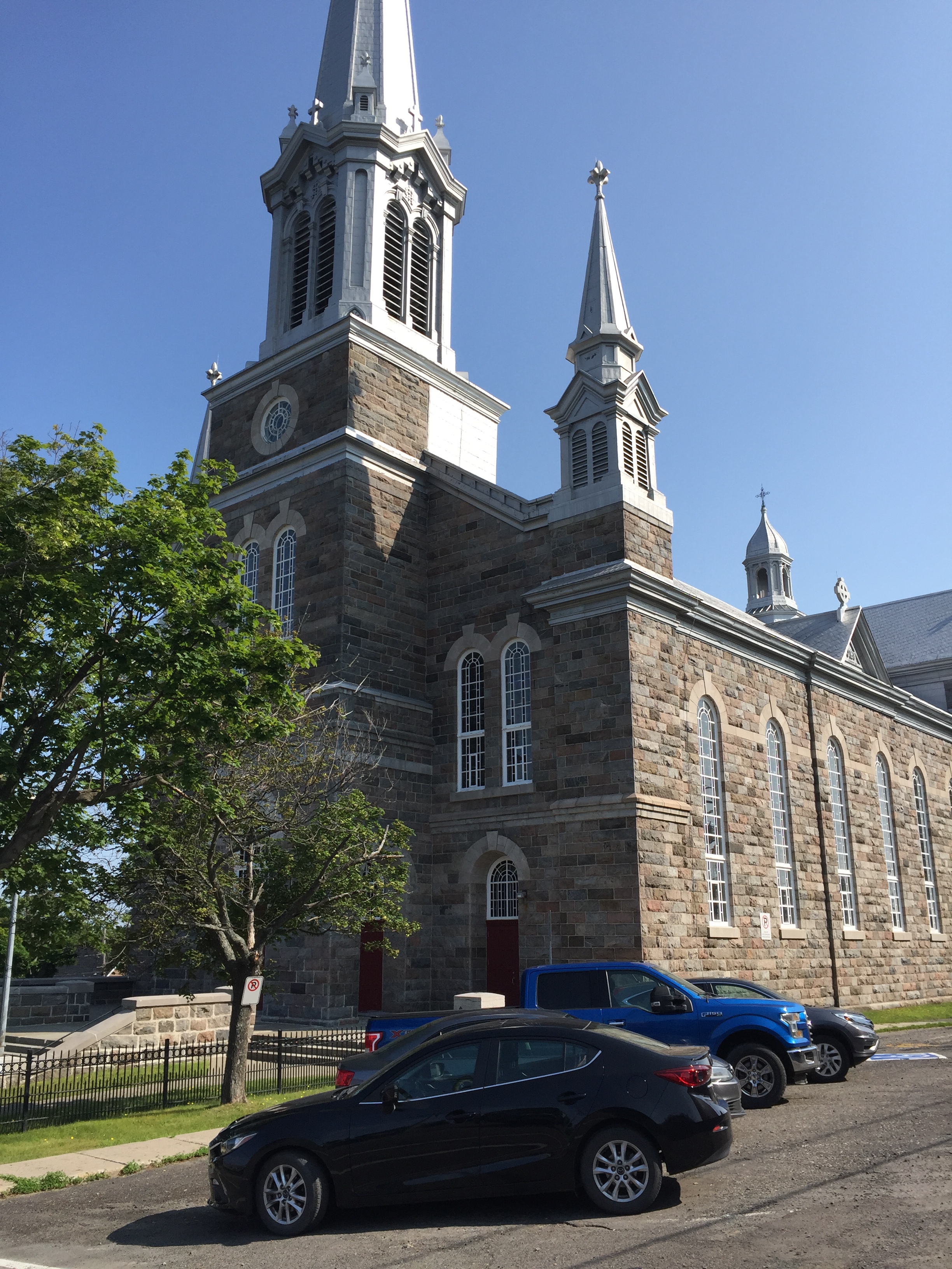 With our Timmy’s in hand, we got back on the road and headed towards Rivière du-Loup. You may recall this is the birthplace of Connie’s grandfather (on her mom’s side) Lindsay. We decided to drive through the downtown, so she could see the place. Well the downtown streets were extremely narrow and this week they were doing road work (oh yes, remember Bernie, he was full of it – there was all kinds of roadwork in Quèbec today). Anyway the most special part of the road work in Rivière du-Loup was the 1 metre mounds of gravel placed every 10 metres or so. These were used to cover the temporary water pipes. Now imagine towing a trailer through streets barely wide enough for one vehicle let alone two and then driving over these massive speed bumps, praying that the trailer wouldn’t bottom out. To add insult to injury, several of the streets in River du-Loup are about an 8 percent grade. Slowly but surely we were able to turn around and make our way back to the TransCanada.